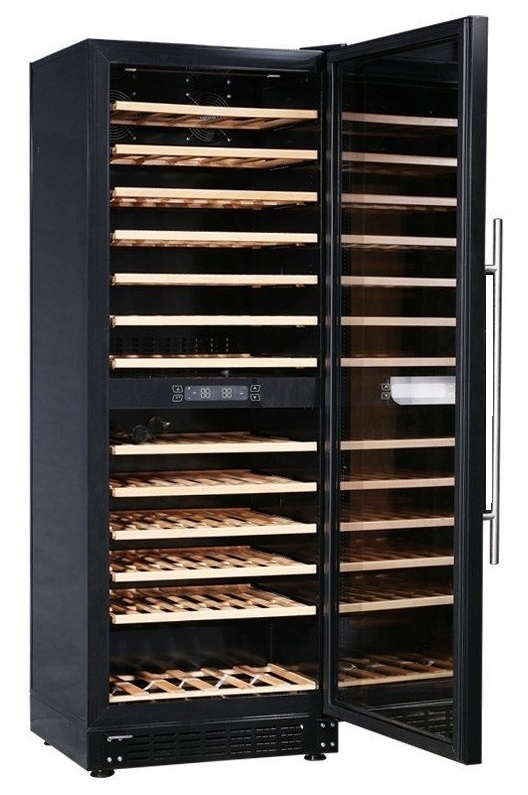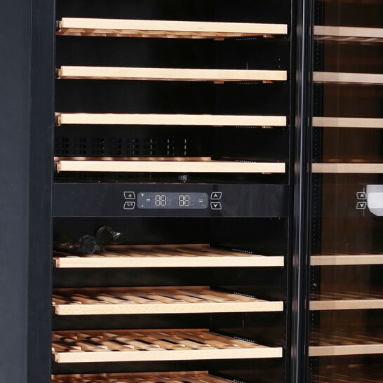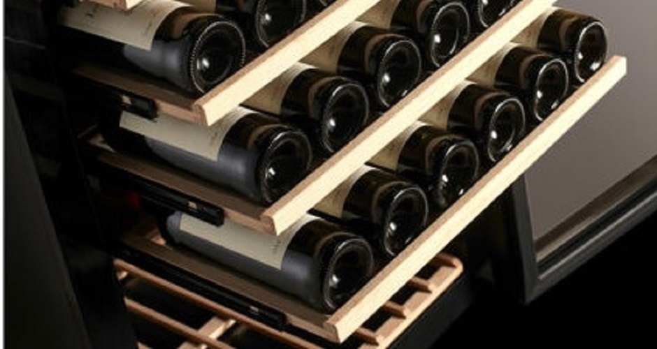 De wijnkoelkast heeft een luxe uitstraling vanwege de houten wijnrekken en door de glazen deur zie je direct hoeveel flessen wijn je nog in huis hebt.