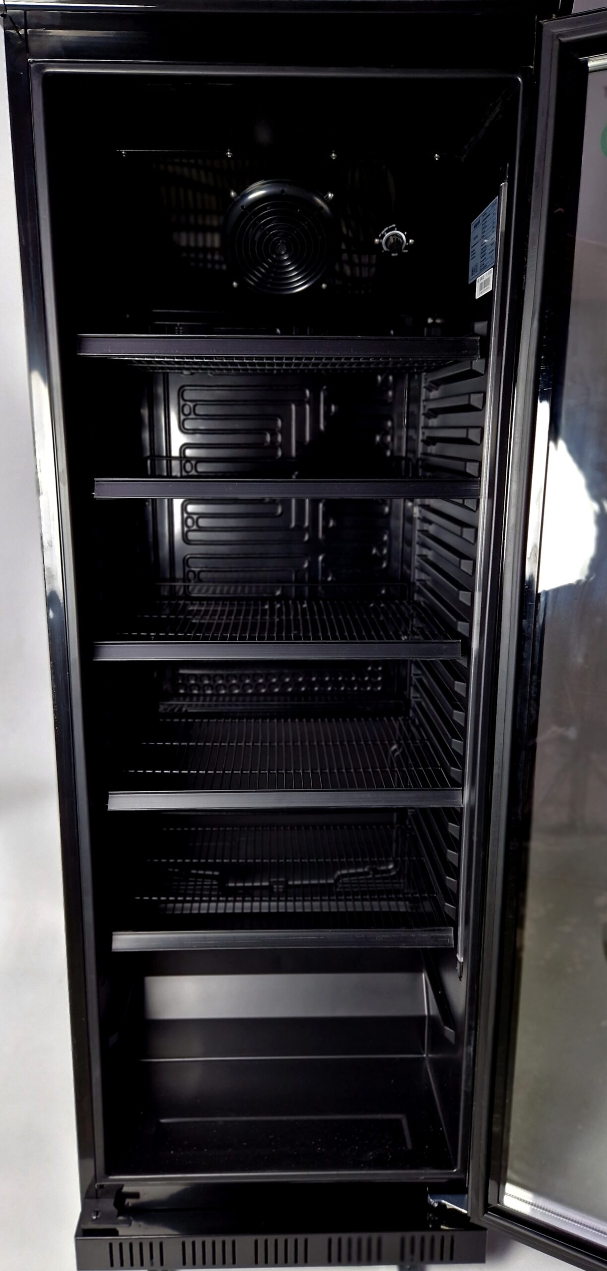 De koeler wordt geleverd met 5 verstelbare zwarte draadplanken, zelfsluitende glazen scharnierende deur en 1 verticaal geplaatste LED-strip over de hele lengte.